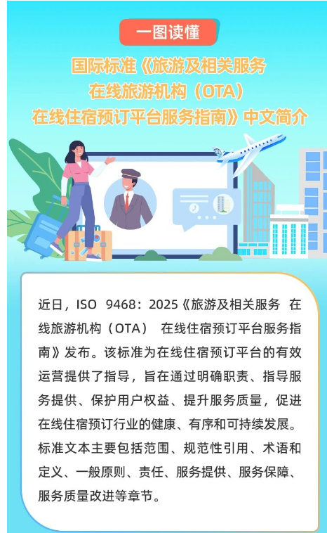 我國(guó)牽頭制定全球首個(gè)在線(xiàn)旅游機(jī)構(gòu)相關(guān)國(guó)際標(biāo)準(zhǔn),以“中國(guó)方案”推動(dòng)全球旅游服務(wù)標(biāo)準(zhǔn)化進(jìn)程。近日,我國(guó)牽頭制定的《旅游及相關(guān)服務(wù)在線(xiàn)旅游機(jī)構(gòu)(OTA)在線(xiàn)住宿預(yù)訂平臺(tái)服務(wù)指南》(ISO9468:2025)國(guó)際標(biāo)準(zhǔn)正式發(fā)布。這是全球首個(gè)在線(xiàn)旅游機(jī)構(gòu)相關(guān)國(guó)際標(biāo)準(zhǔn),旨在規(guī)范全球在線(xiàn)住宿預(yù)訂平臺(tái)及其服務(wù),破解“大數(shù)據(jù)殺熟”“捆綁消費(fèi)”“退改難”等痛點(diǎn),構(gòu)建公平透明的消費(fèi)生態(tài)?!吨改稀访鞔_了平臺(tái)方和住宿服務(wù)提供商的責(zé)任,規(guī)范了訂購(gòu)、支付、退改、評(píng)價(jià)等環(huán)節(jié)的服務(wù)條款,提出了信息安全、財(cái)務(wù)安全和隱私保護(hù)等方面的服務(wù)保障要求。其發(fā)布是中國(guó)參與全球標(biāo)準(zhǔn)化工作的生動(dòng)實(shí)踐,將推動(dòng)全球旅游服務(wù)在標(biāo)準(zhǔn)化軌道上實(shí)現(xiàn)高質(zhì)量發(fā)展。